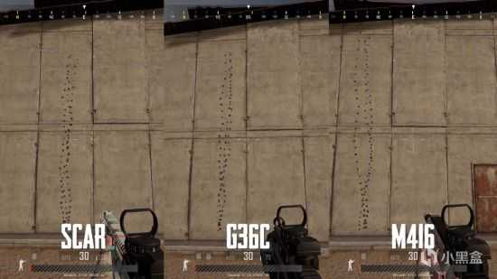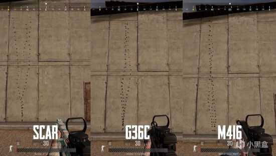 SCAR、G36C、M416全自动模式下30发子弹射速对比。
