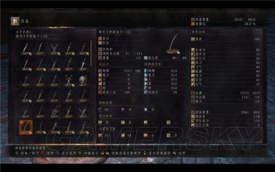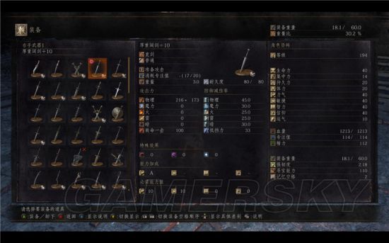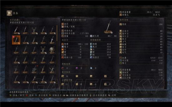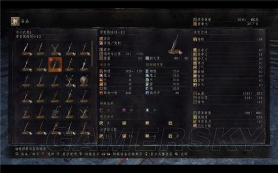 发育旅程:火焰阔剑→粗制黑暗剑→厚重黑暗剑。生命加到19,增加力敏到可使用武器,生命到27,持久到正好5刀,后一直加力量到40,成型。