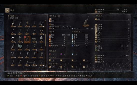 发育旅程:火焰阔剑→粗制阔剑→切菜肉刀。生命加到19,持久加到正好4刀,生命到27,后一直加力量到40,成型。