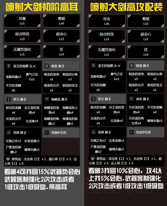 一、【喷射大剑初阶高耳】,使用看破4技能直接找回15%武器的负会心率,省出武器客制强化会心的次数,针对新人无龙脉石亦可使用,带高耳牺牲攻击技能。武器可客制2次攻击或者1攻击+1吸血。