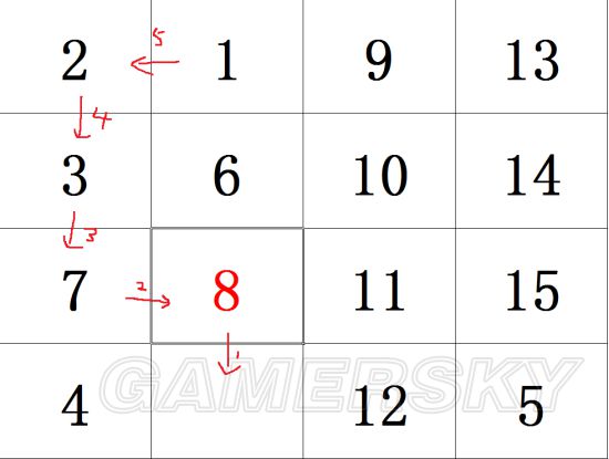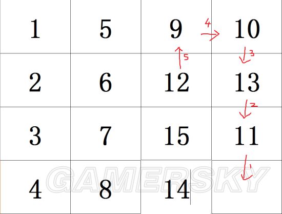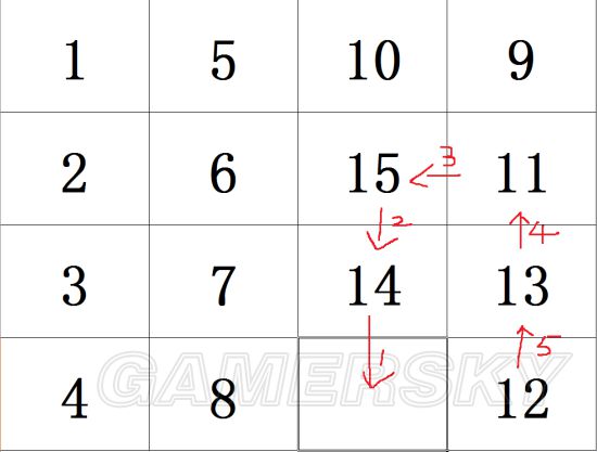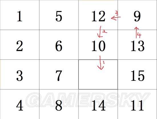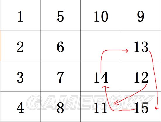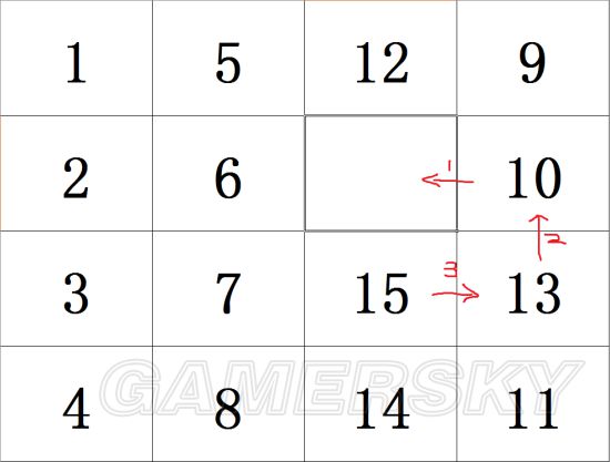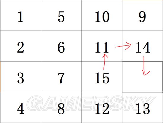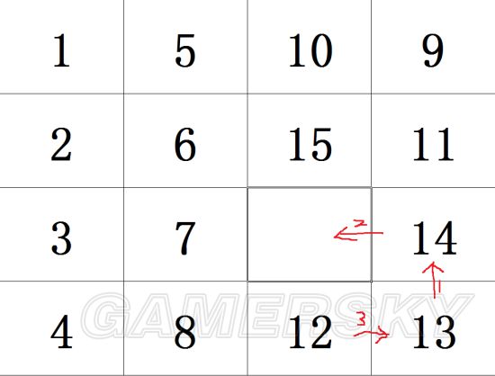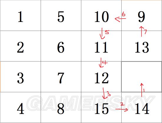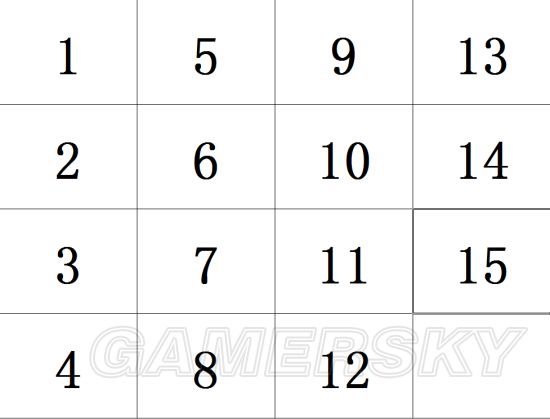 相国寺对话赵妽会触发剧情,开始拼图,首先把图看成个4*4的16格子,目的把15个数字排成下图: