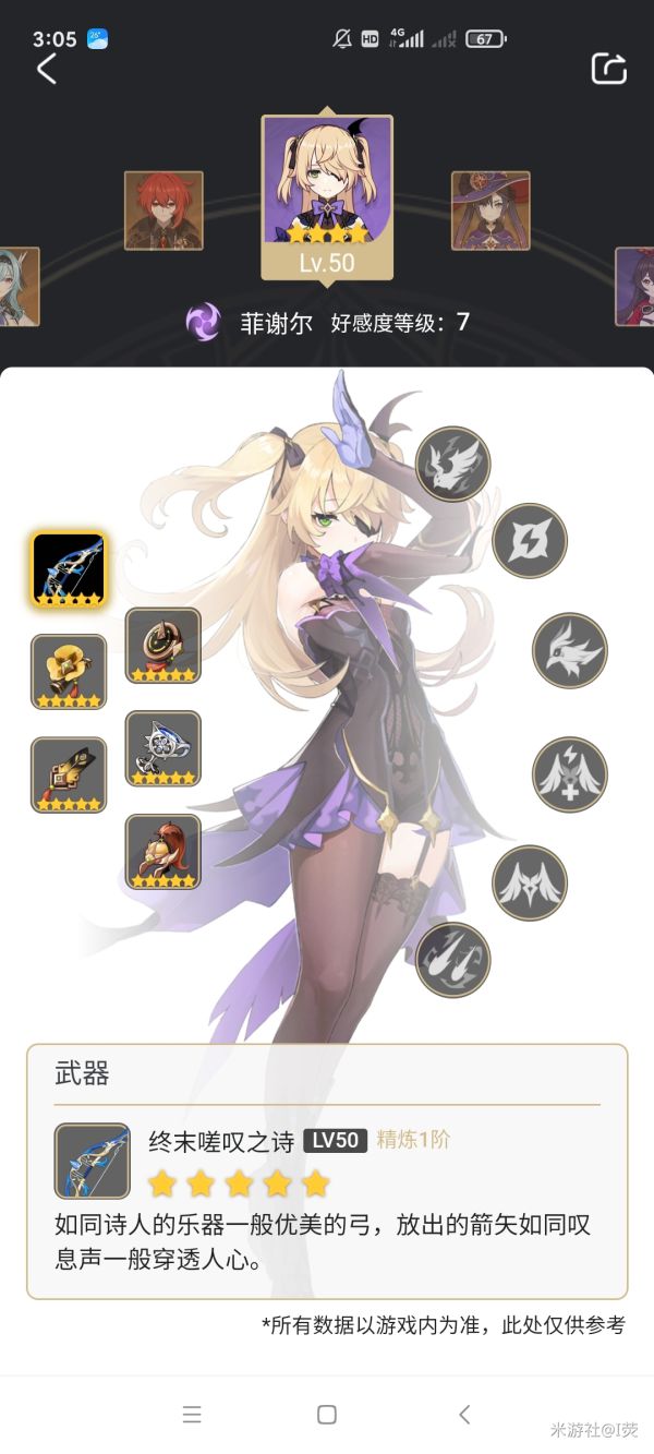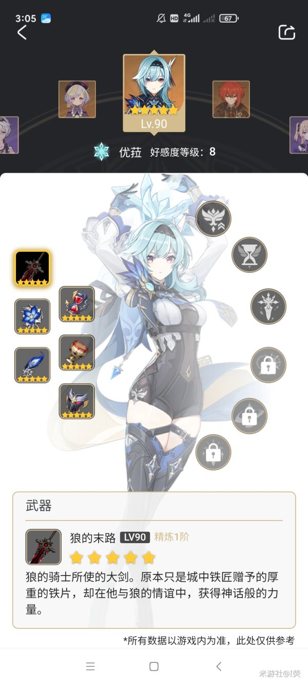 至于手感只能慢慢去适应,优菈作为目前唯一一个五星物理c,各方面突出但又均衡,完全不极端,在未来可以一直使用。其实也没啥可以说的,可以单纯看作分享一套比较好用的阵容吧,兄弟们可以去试一试,下版本可以将皇女带换成雷主完全弥补充能问题,雷主带宗室4替代千岩buff。