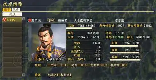 鸟羽城:四层天守(+常备兵)、枡形门(+少量常备兵)、造船所(+常备兵)