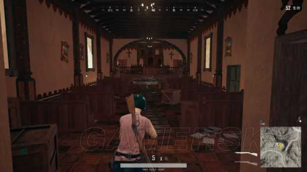 教堂结构简单,这些椅子旁边都会刷些物资,肥不肥全看运气。一路走到小水泉后面的楼梯上,会有两张桌子,左右两边各有一扇门,左边的门是另一个入口,右边的门通向另一个小房间。在教堂里边视野狭窄,看不到外面的情况,一般不建议卡在教堂里边。
