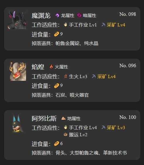 魔渊龙4,焰皇4,阿努比斯3。矿点如果地形复杂就用阿努比斯,体型小不容易卡住。用焰皇的时候需要基地里不需要生火,或者基地需要兼职生火的时候。碎岩龟感觉是挖矿动画太长了,还是饱食度降低太快了,挖不了几下就去吃东西,它带在身上非常非常好用,自动挖矿不好用。