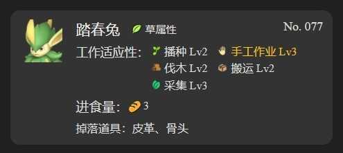 特别说一点,踏春兔因为多一个伐木工种,所以他的工作顺序会更混乱一些,因为要先满足大工作顺序上,种植>伐木>手工,然后才是每种帕鲁的同样工作下的等级排序。所以他要么是在种植,要么是在伐木,只有伐木工作地满员了(3只满员),才会来做手工,结果就造成他干活的时候可能会到处跑。但其实这是有意义的,因为各个时候,我们基地的工作重心是不断变化的,比如我想孵蛋的时候,配种的帕鲁需要占用更多位置了,难免需要剔除一些帕鲁出来,我就可以利用种植>伐木的大工作顺序,把伐木的紫云鹿和种植的百合女王剔除,换上两种职业兼顾的踏春兔,他会优先去种植,有空再去伐木,这样就可以腾出更多的空位进行配种的需求。下面讨论不同基地的分工体系的时候,会再聊一下。
