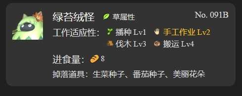 独一份的4级搬运工绿苔绒怪(白绒雪怪),因为有着伐木技能,所以它一般都是优先考虑伐木,又因为它的移动速度真的很慢,所以它的4级搬运大概是用来帮玩家提高负重的,矿点不推荐用它。