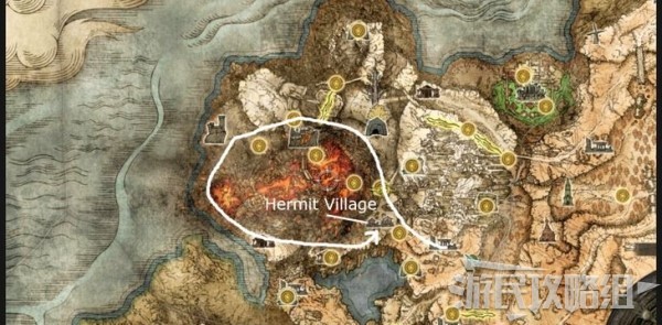 从亚坛高原的威达姆废墟出发,向西走抵达赐福「沸滚河终点」,再向南走穿过岩浆湖,经过遁世者的破屋后向东走,抵达赐福「遁世者的破屋」,然后再向东走即可抵达遁世者村。