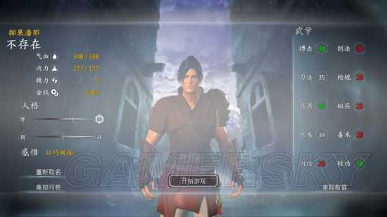 左边可以看到角色初始属性,包括称号、人格、金钱和感悟。右边则代表武学天赋,如果对天赋不满意可以重骰数值。