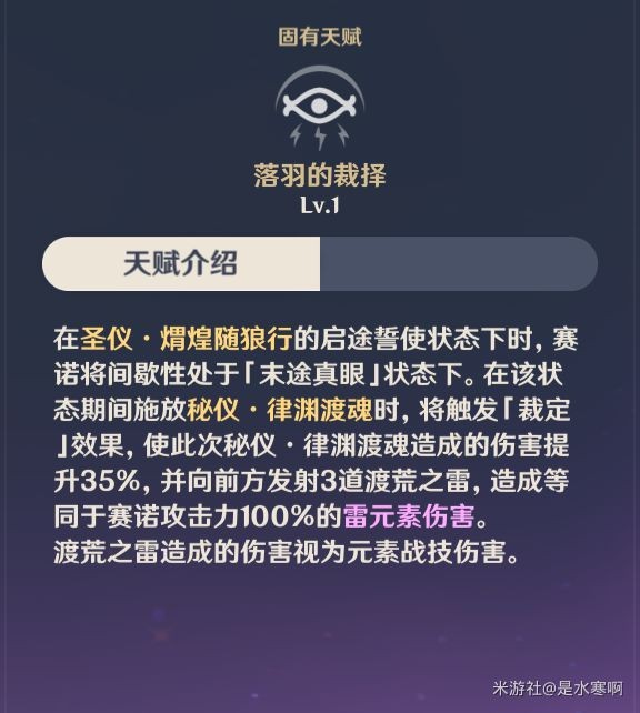 效果:赛诺的普通攻击命中敌人后,雷元素伤害加成提升10%,持续4秒。该效果每0.1秒至多触发一次,至多叠5层。