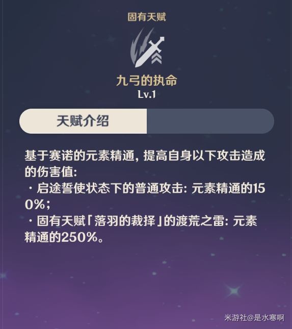 该突破天赋则是加强元素精通对赛诺的伤害提升能力,以及直白的告诉玩家,赛诺的主要输出手段是普通攻击,而不是重击。