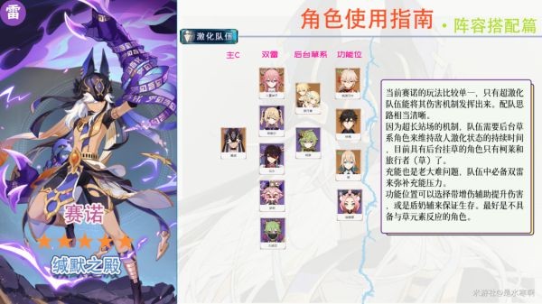 效果:赛诺开启Q技能后,触发雷系相关反应后,将为队伍中所有角色(除赛诺自己)恢复3点元素能量。该效果在一次Q技能中,至多触发5次。