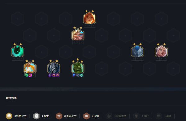 阵容坦度的较足,4骑士提供全员减伤,3铁甲为全员增加护甲,3圣光羁绊还能带给芮尔与蕾欧娜极高双抗,对物理阵容相对克制。