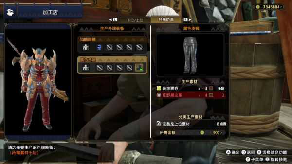 任务结束后的报酬里我们能看到一个叫作“狂野黑皮革”的素材,将这个素材拿到武器店,在生产外观装备那一栏我们选择特殊装备(按R键切换到特殊装备),就能解锁这个叫“黑色皮制”的新外观了,实际上就是一条皮裤嘛,对于美型猎人来说穿搭的组合方式又多了几种。