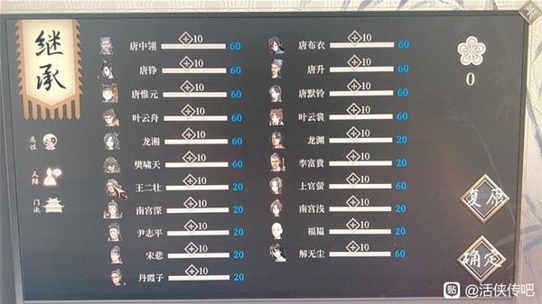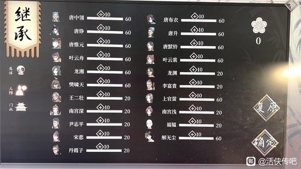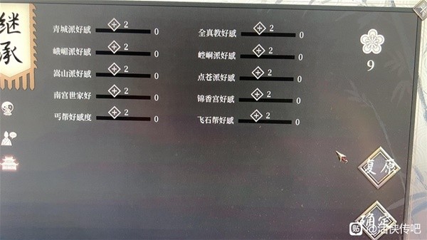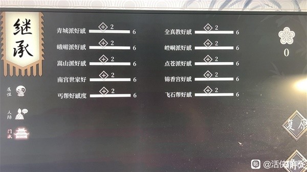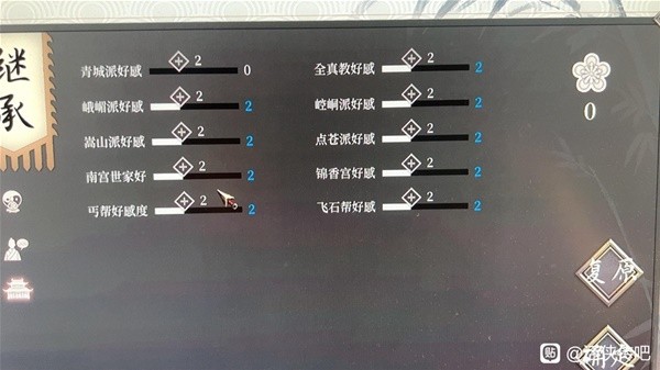 门派好感度是可以在0点数情况下点出1点,变成2好感。除了青城派,其他9个都可以点一下。如图2。那么就点复原就可以白嫖点数。如图3。