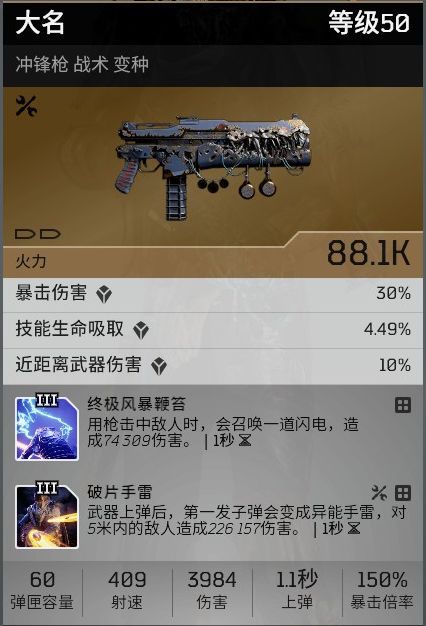 1.更快的装填时间:一发狙的装填时间为1.4秒( 还是1.6秒来着,记不清了 ),而冲锋枪的装填时间为1.1秒,更加契合手雷模组1秒的内置CD,间接提高实际出伤能力。