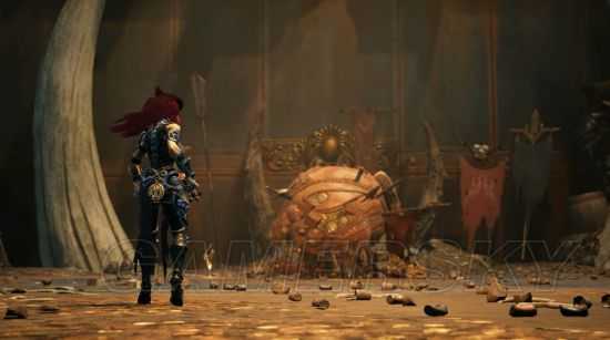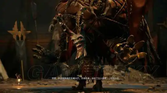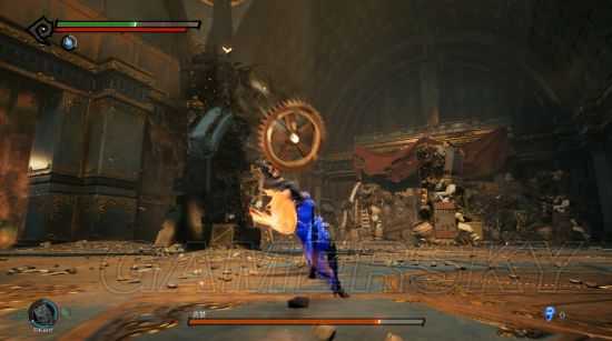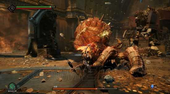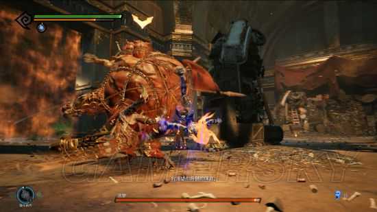 周旋一段时间后,随着一阵奸笑,它会抓起一个大牛角(其实是恶魔的角)当武器,这时候就比较猛了,不要在它身旁停留过久,打完就跑不要贪。