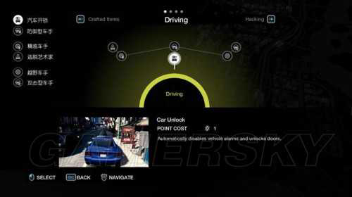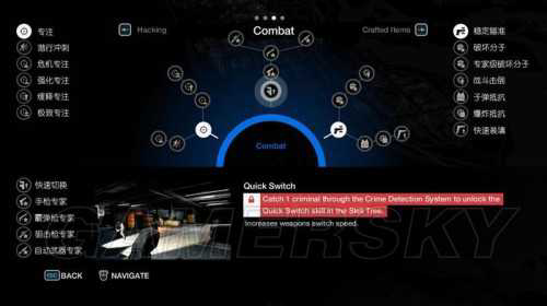 下面小编就和玩家分享下自己的游戏加点心得,当然小编是手残党,如果哪位大神看不下去了,请轻喷。小编玩了感觉游戏中骇客技能树的技能优先级最高,比较好用,和任务也息息相关,而自制品技能树的技能最不推荐,用处不大。骇客技能树中推荐工具包、公共设施交通、交通信标、桥梁、路障等逃命技能(难道是因为小编的设定就是这样的?),而电池和提款机等技能就看个人爱好加点,其中停止直升机则要慎点,因为很多视角看不到直升机。而战斗技能树的技能可以围绕专注来点,因为这技能真乃我等手残党的福音。驾驶技能树和自制品技能树则就看各位玩家的喜好了,用处不大不必特意解锁(收集癖无视)。技能的加点也不必太过拘泥,因为主线下来支线做几个技能也能开一大半了,加错一些问题都不大。