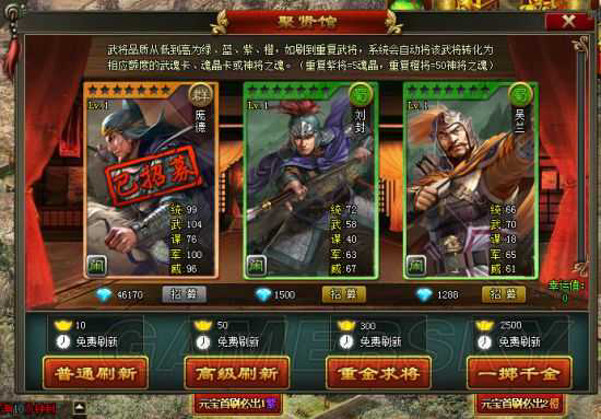 高级刷新:可以刷新出绿将,蓝将,紫将,有机率出现橙将。