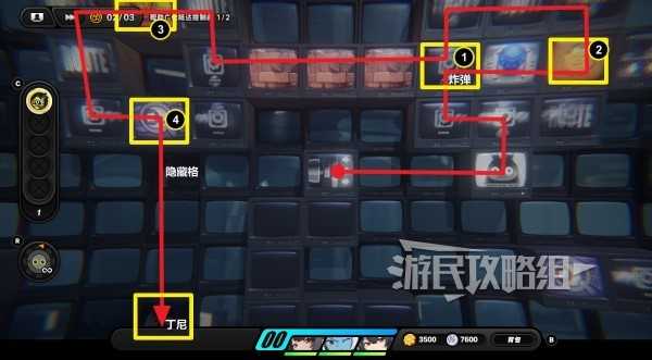 拾取丁尼后,返回此区域开始放炸弹的位置右侧的蓝色按钮处,踩住蓝色按钮,在按钮上放置一个炸弹(就是下图①的位置),然后走右侧弹簧到达右侧区域,与下方放大镜图标互动开启隐藏区域。