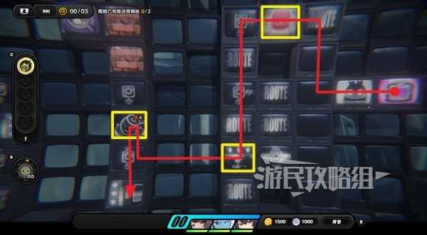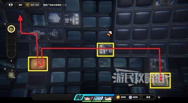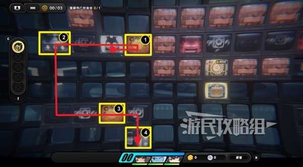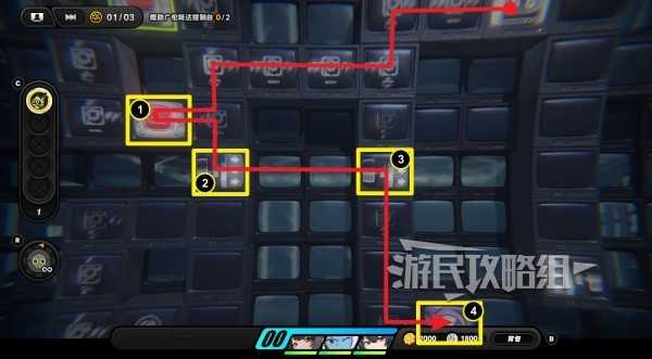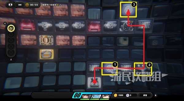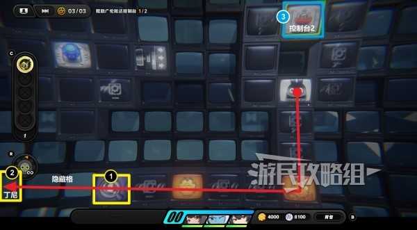 进入放大镜图标开启的隐藏区域,沿路走拾取齿轮硬币,再与尽头的放大镜图标互动,左侧又会开启新的隐藏格子,在隐藏格子最左侧有丁尼。拾取丁尼后沿路返回到放大镜所在位置,往上走与控制台互动(下图③的位置),选择【呼唤】让广伦来操作控制台。