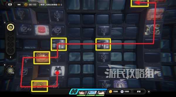 使用弹簧弹到右侧区域,往左上方走,在蓝色按钮旁边的格子里放一个炸弹,然后踩着蓝色按钮往右拾取齿轮硬币,再往上走一格,往左走一格让炸弹爆炸。炸掉砖块后,沿着砖块所在通道往左走,拾取上方的观测数据,和下方的放大镜图标互动,放大镜图标下方有一列隐藏格子,往下走4格可以拾取隐藏的丁尼。