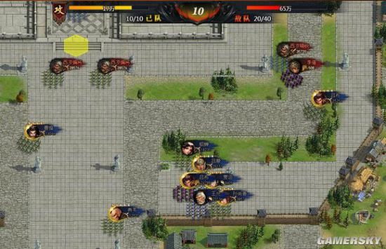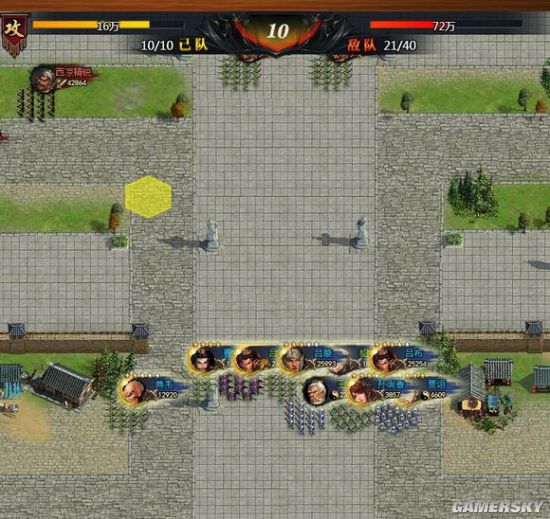 第10回合站位:第9回合我用来在城外站位。第10回合才入城,曹操站最左上边负责吸引中间和左边的火力,其它部队主要进攻右边军营