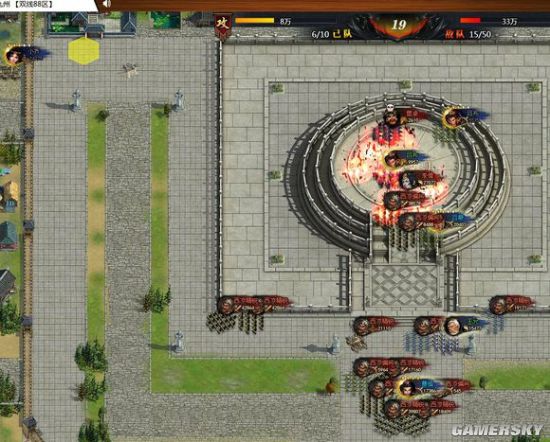 前期打法吕蒙队从左边进攻,王允三队杀完两个妖术队支援吕蒙,我花了8回合才清光了城外小兵。盟友吕布最好保护一下,别损太多血。