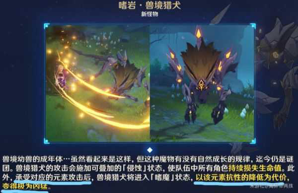 这里可以看到划线的部分写道:承受对应的元素攻击后,猎犬进入嗜魔状态,以元素抗性的降低为代价,变得极为凶猛。因此根据12层1、3间上半雷元素狗,下半岩元素狗的怪物顺序可以进行配队组合。