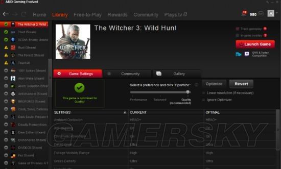 如果你的显卡是AMD Radeon系列或者Nvidia GeForce系列,那么你可以AMD GamingEvolved或者GeForce Experience来快速优化游戏,进行画面和流程成都的平衡。你需要做的只是AMD Gaming Evolved或者GeForce Experience,进入游戏库,然后进去调整你的喜好就行了。同样是在驱动里面