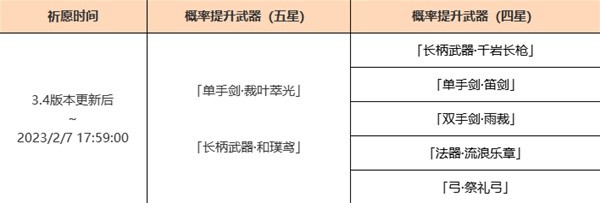 活动期间,限定四星武器「长柄武器·千岩长枪」,四星武器「单手剑·笛剑」「双手剑·雨裁」「法器·流浪乐章」「弓·祭礼弓」的祈愿获取概率将大幅提升!