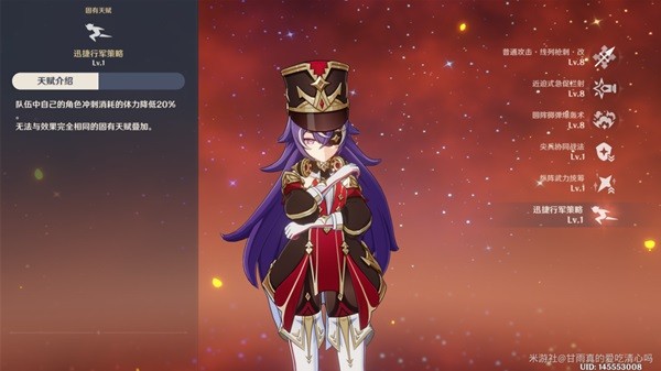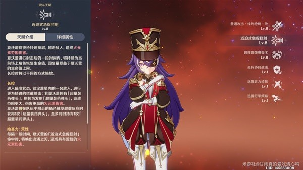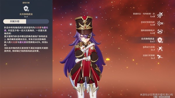 天赋,队伍中的角色均为火雷属性的时候(至少一名火和一名雷),为队友施加buff,触发超载反应后,受到反应影响的敌人减少火元素和雷元素的抗性40%持续6s。当队伍有除火雷以外的元素角色,则该天赋不触发。