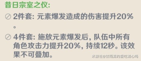 天赋增伤需要达到四万血才可以吃满增伤,首选2+2生命(泛用),次选宗室四件套。