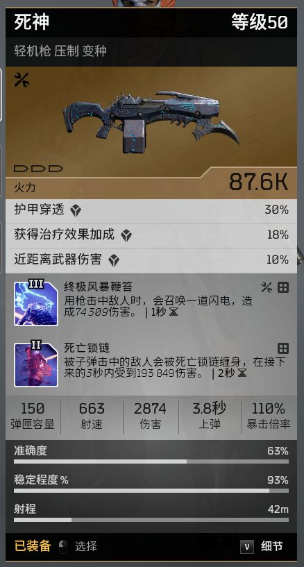 武器是压制轻机枪+两个输出模组,由于火山弹药自带部分AOE能力,所以选单体伤害的模组加强boss击杀能力就好。护甲穿透对火山弹药是没用的,优先选爆伤和吸血,我是没刷到合适的只能用死神凑数。