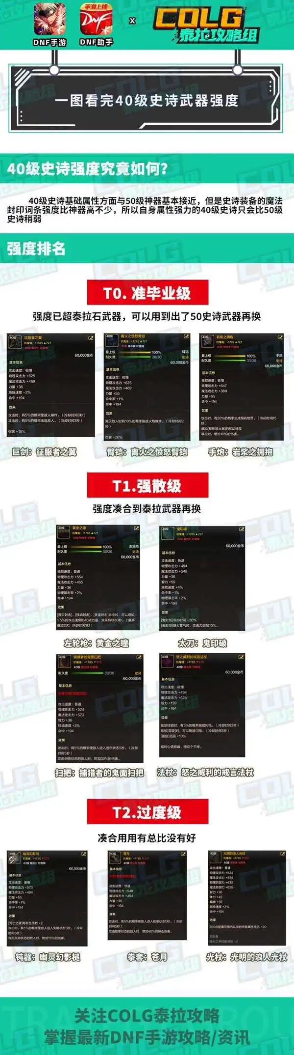 《地下城与勇士手游(DNF攻略)》中40级史诗武器包括征服者之翼、岩浆之拥抱等,那么这些武器的强度如何?请看下面由“COLG泰拉石攻略组”带来的《地下城与勇士手游(DNF攻略)》40级史诗武器强度排名,希望对大家有用。