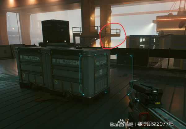 第十步:这地方就是当时和罗格放倒了叛徒拿强尼集装箱钥匙的地点了,之后看圈那有个梯子没?上去启动升降机按钮,之后保时捷车的货柜就降下来了,过去拿车就行了