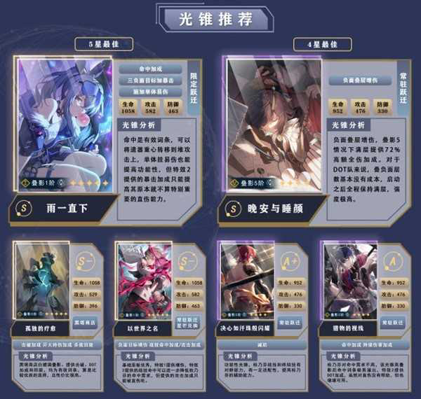 「猎物的视线」:桂乃芬对命中需求不高,该光锥高叠影后命中词条极易溢出,特效2提供DOT加成,虽然对直伤没有帮助,但也堪堪可用。