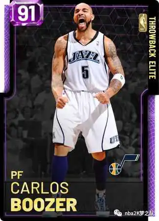 爵士队的精英球员则是大家非常熟悉的:卡洛斯·布泽尔。紫色布泽尔拥有强壮的身体(94力量)和扎实的内线脚步(92背打、92勾手、92后仰),而且三个挡拆金章(挡拆投篮手、掩护达人、铜墙铁壁)也将大大提升他的挡拆质量,挡拆外弹之后进行中投(93)将成为布泽尔的主要得分手段。