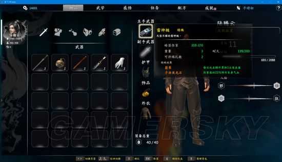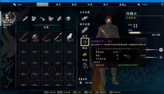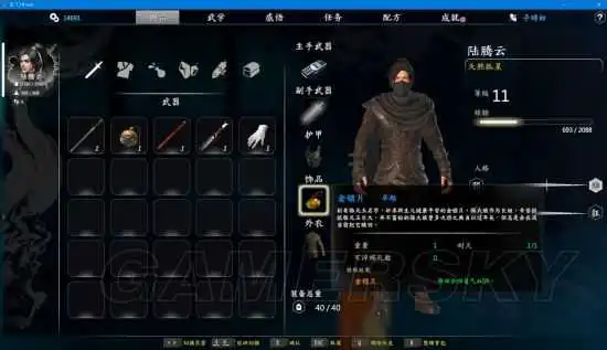 功夫再高也怕菜刀,武学不强力装备来补。武器就用雷神锤,重量3,淬炼石头打上翡翠和子母夜光石,铁匠铺友好度达到150就能打造,材料1玄铁、1黄金、1寒铁、1镔铁,打造子母追魂钉出,新手村铁匠全天都在。防具就用满防的玄铁锁子甲,材料2个玄铁、2个珊瑚金,重量仅35。饰品就用扒骆元玉的金锁片,每回合回血6%。由于等级低时负重低,只有暗器武器能完美配合最强防具玄铁锁子甲的负重,配上天煞孤星天赋,1个人通关都够了,后期转型刀剑棍等武学也容易。极限点开局选择或去书院换本暗器秘籍流星飞掷,有了装备10级以下过关也容易。本次开局11级属性如下图:
