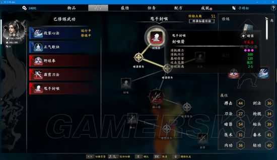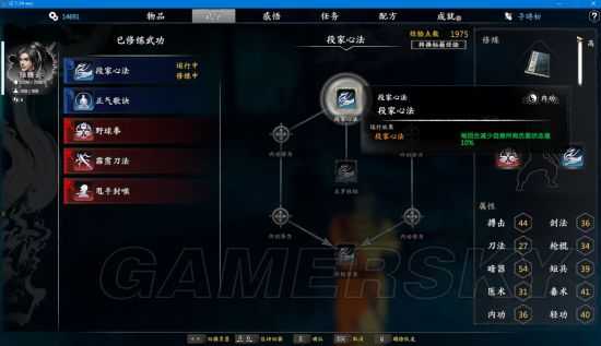 获得洗髓经的前置任务很简单,最好白天完成前置,晚上做最后一步。前置去右上角破庙选择第三项旁观,再去噶玛寺后出来问门口的猎人,再去左上山头洞穴内选择第一项。工欲善其事,必先利其器,现在就可以准备了。首先内功准备好段家心法装备上,初级就行能减少10%负面状态;再把暗器甩手封喉练到见血特效,消耗精力减少一点变为3。特别强调暗器只有距离中间的时候攻击力最大,甩手封喉的范围是2-5,因此距离3.5出招的时候攻击力最高,距离可以在战斗中按Alt键显示,暗器攻击优点是距离远敌人无法反击。平时吃些成就给的和自己采的灵芝雪莲,气血轻松2000以上。本次开局11级属性如下图: