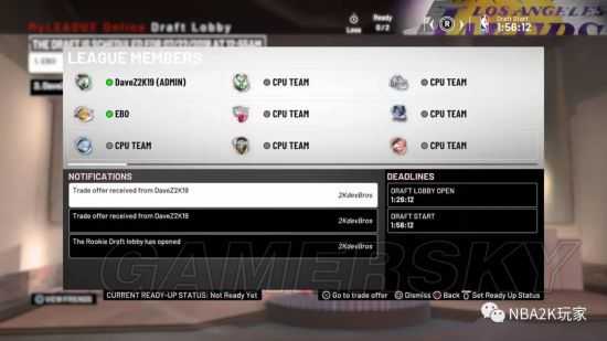 对于NBA 2K19,如上文所述,我们希望将所有可用的离线内容直接进入在线模式中。这包括一个实时的自由赛季,NBA选秀,以及更多的赛季休赛。而一种便捷的“联盟成员小组”选项可以从任何地方切出来,让你快速访问在线联盟中正在进行的事情!你可以通过按下右摇杆来访问它。这个小组模块分为三个部分:顶部列出了联盟中的所有成员和他们当前的在线状态(这是非常有帮助的,特别是当试图调整你的联盟事件时)。此外这一部分的面板还可以告诉联盟其他所有成员你已经完成并准备进入下一个休赛期。当联盟的所有成员都按下“准备好”的按钮时,联盟将会前进,即使时间在计时器内。当然,你还可以定制你的“准备”计时器(例如,可以设置它自动推进剩余的休赛期)。