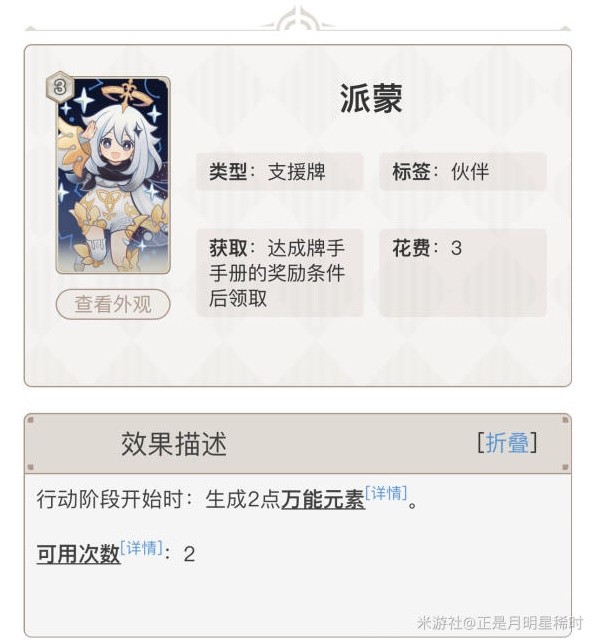 这是很直观的能直接省一个骰子的卡牌,配合上风共鸣骰子牌,能实现(3 + 切人 + 3 + 3)的完美骰子利用。这可以是召唤3种奥兹、也可以是召唤2种奥兹,最后使用大派蒙蓄爆。