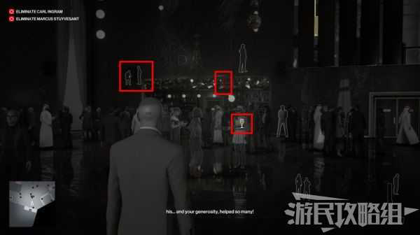 长按Ctrl可以使用杀手直觉。在直觉状态下,可以互动的道具以黄色高亮显示,武装人员会以白色实线勾勒边框,而任务目标则会以红色高亮显示在视野当中。