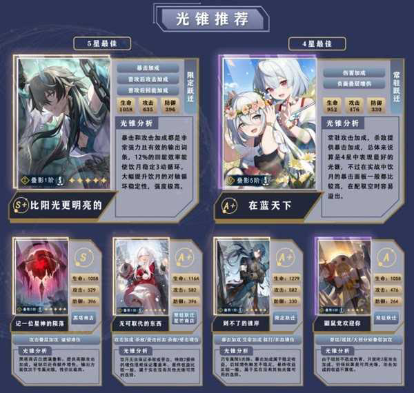 「比阳光更明亮的」:饮月专属限5光锥。暴击和攻击加成都是非常强力且有效的输出词条,12%的回能效率能使饮月稳定3动循环,大幅提升饮月的对轴循环稳定性,强度极高。