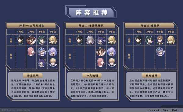 目前饮月的配队思路为清一色的三保一,但由于饮月配队的先决条件之一就是战技点自洽,因此虽然饮月的可用组件较多,但也并不是所有角色都能无脑使用。