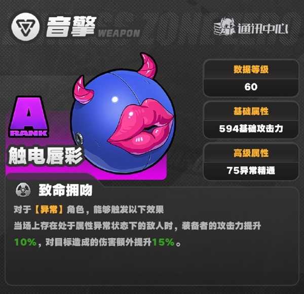 场上有异常状态的敌人时获得增伤和攻击力。特效泛用且启动简单,当前版本的异常队伍来说,把派派专武除去,其余俩A级音擎在当前版本启动还是较为困难的。考虑到异常音擎的强度来说,触电唇彩还算可以的。不过这也只是针对格莉丝来说的,后续版本如果出其他异常角色不保证触电唇彩还有优势。