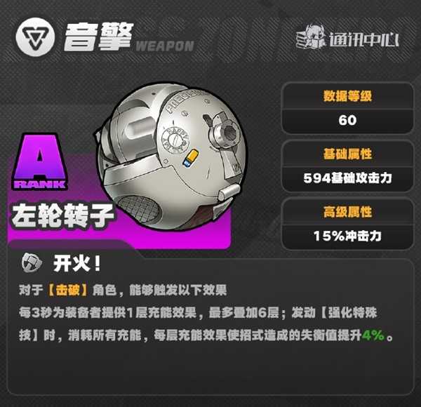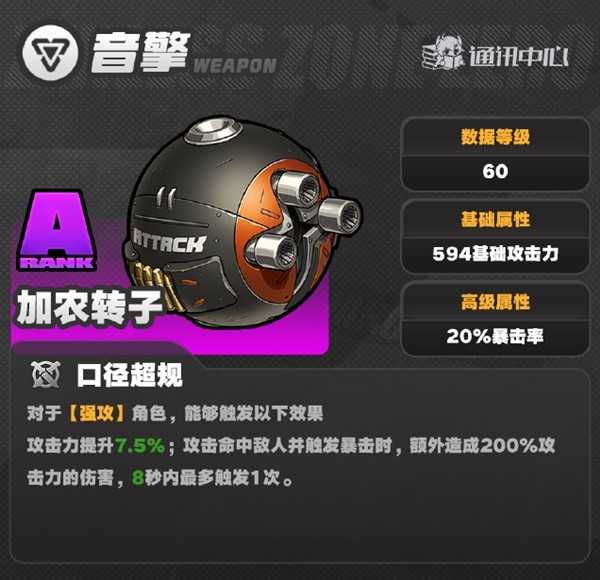 副词条暴击率,特效加攻和额外倍率,十分泛用的一个强攻用音擎。如果你有11号、艾莲或者猫又而且主练,目前又抽不到专武。那么加农转子是一个非常不错的选择,尤其是对没有专武的艾莲来说。