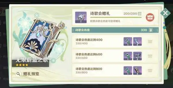 ● 完成各个玩法,可获得「诗歌会热度」。诗歌会热度达到指定值可以获得无垠蔚蓝之歌(活动绝版武器)、智识之冕、活动专属武器精炼材料等奖励。