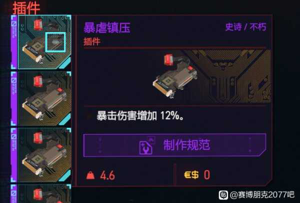 《赛博朋克2077》玩家们能够通过为装备安装插件提升输出能力,那么想要提升暴击伤害所使用的暴虐镇压插件要在哪里找呢?请看玩家“死者往矣”分享的《赛博朋克2077》暴虐镇压插件制作图纸获得位置,希望能为各位玩家带来一些帮助。