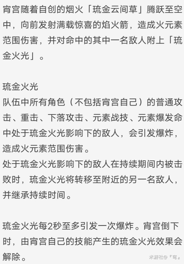 值得一提,宵宫的普攻火焰附着效果隔2次攻击一生效,宵宫大招有很强的火焰效果破盾很好用。